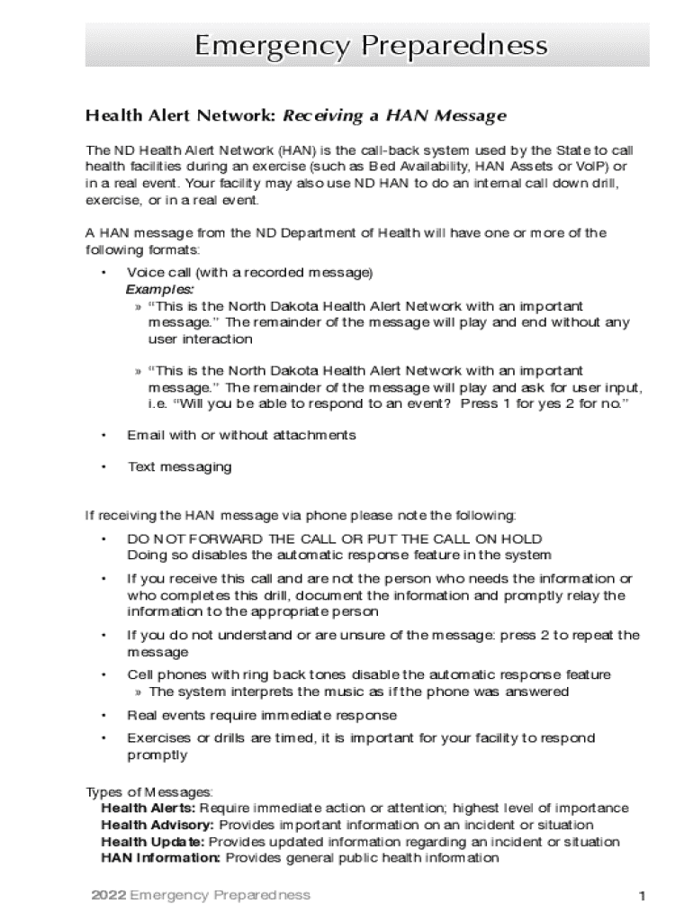 Learn about the ND Health Alert Network for emergencies, including message types, response protocols, and how to request a HAN message for drills or real events.