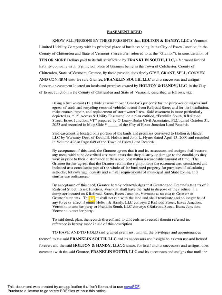 This easement deed grants Franklin South, LLC a 12\' wide access and utility easement for trash removal and stormwater maintenance in Essex Junction, Vermont.