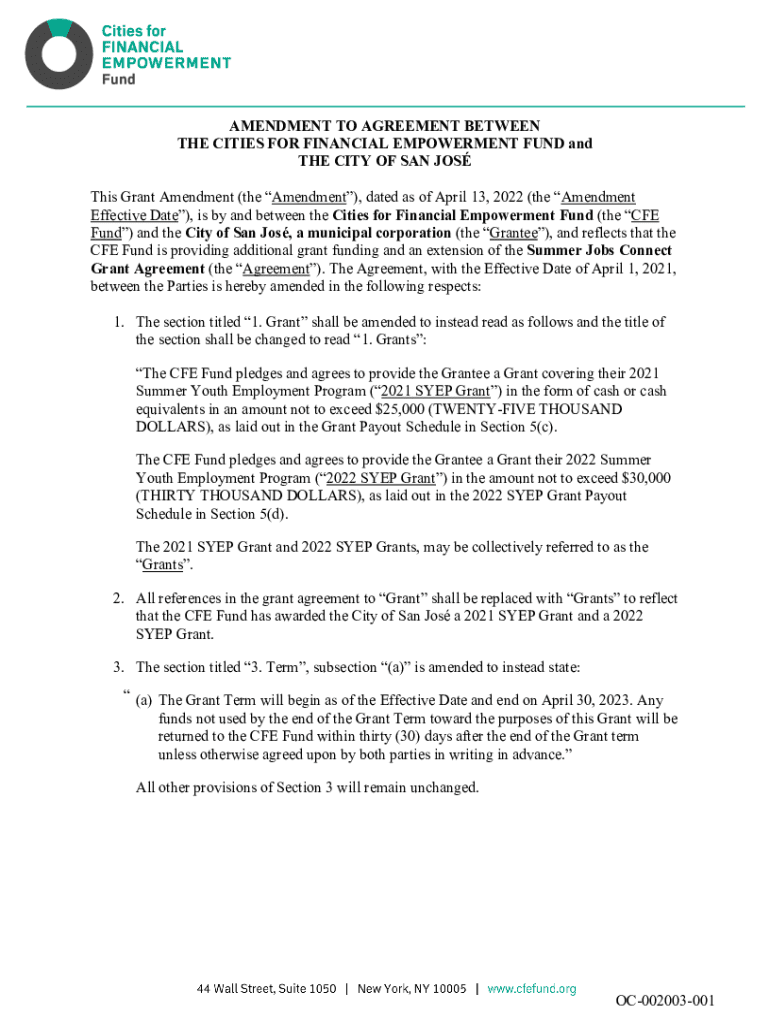 AMENDMENT TO AGREEMENT BETWEEN THE CITIES FOR FINANCIAL EMPOWERMENT FUND and THE CITY OF SAN JOS This Grant Amendment (the Amendment), dated as of April 13, 2022 (the Amendment Effective Date), is