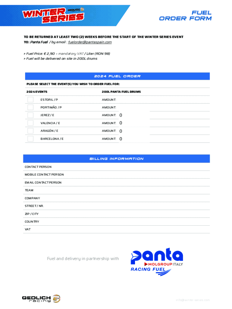 ORDER FORM Fuel Price: 2,90 + mandatory VAT / Liter (RON 98) Fuel will be delivered on site in 200L drums202 4 FUEL ORDER