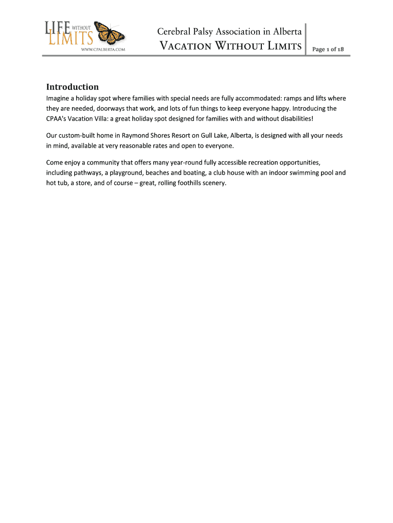 Cerebral Palsy Association in Alberta Vacation Without Limits Page 1 of 18 Introduction Imagine a holiday spot where families with special needs are fully accommodated: ramps and lifts where they