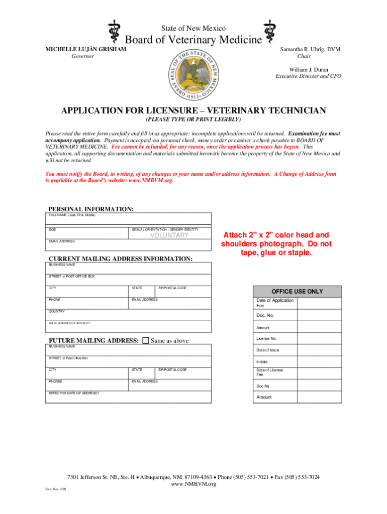 State of New MexicoBoard of Veterinary Medicine MICHELLE LUJN GRISHAM GovernorSamantha R. Uhrig, DVM Chair William J. Duran Executive Director and CFOAPPLICATION FOR LICENSURE VETERINARY TECHNICIAN