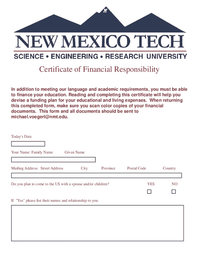 Certificate of Financial Responsibility In addition to meeting our language and academic requirements, you must be able to finance your education. Reading and completing this certificate will help
