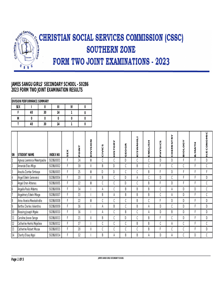 Get the free S0286 2023 FORM TWO JOINT EXAMINATION RESULTS