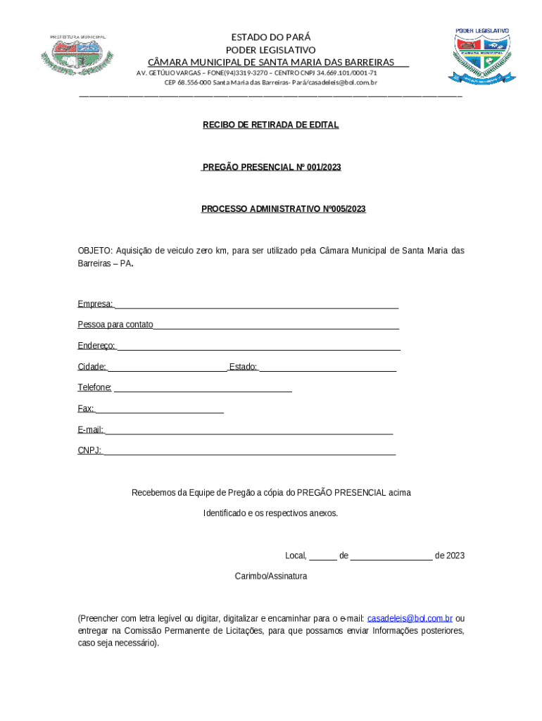 Template OBJETO: Aquisio de veiculo zero km, para ser utilizado pela Cmara Municipal de Santa Maria das Barreiras PA instructions