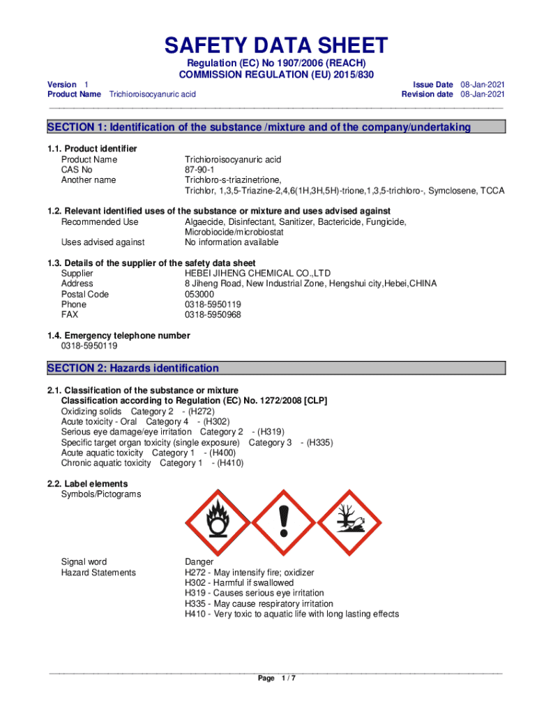 SAFETY DATA SHEET Regulation (EC) No 1907/2006 (REACH) COMMISSION REGULATION (EU) 2015/830 Version 1 Product NameIssue Date 08Jan2021 Revision date 08Jan2021Trichioroisocyanuric acid___SECTION 1: