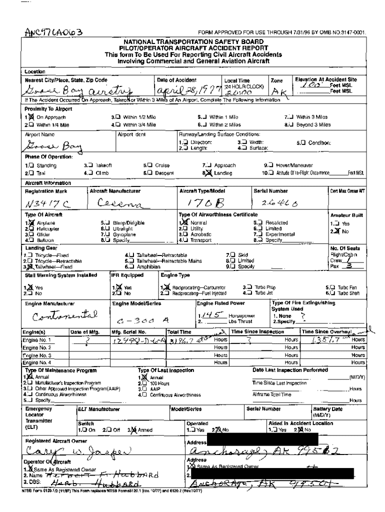 FORM APPROVED FOR USE THROUGH 7/31/96 BY OMB N0.31470001.NATIONAL TRANSPORTATION SAFETY BOARD PILOT/OPERATOR AIRCRAFT ACCIDENT REPORT This form To Be Used For Reporting Civil Aircraft Accidents Involving
