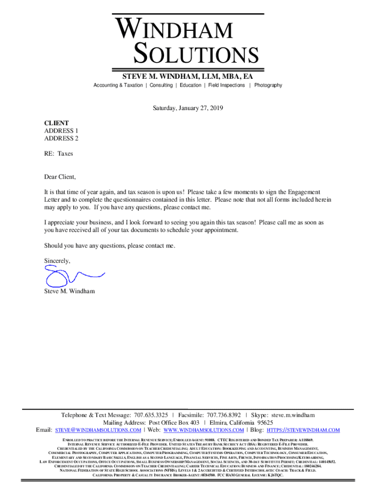 Engagement letter from Windham Solutions for tax preparation in 2019, including fees, client responsibilities, and tax return services.