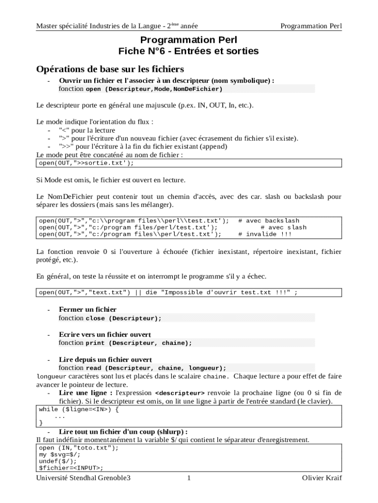 The perlopentut - Apprenezouvrir (des fichiers)la mode Perl is a fillable form in MS Word extension that can be completed and signed for certain purpose. Then, it is furnished to the exact addressee in order to provide certain info of any kinds. The completion and signing may be done or using a trusted service e. g. PDFfiller. These applications help to fill out any PDF or Word file without printing them out. It also lets you edit its appearance for your requirements and put a valid digital signature. Upon finishing, the user ought to send the perlopentut - Apprenezouvrir (des fichiers)la mode Perl to the recipient or several ones by email and even fax. PDFfiller includes a feature and options that make your Word form printable. It has a variety of options when printing out appearance. No matter, how you'll send a document - in hard copy or electronically - it will always look professional and clear. To not to create a new editable template from scratch again and again, turn the original file as a template. After that, you will have an editable sample.