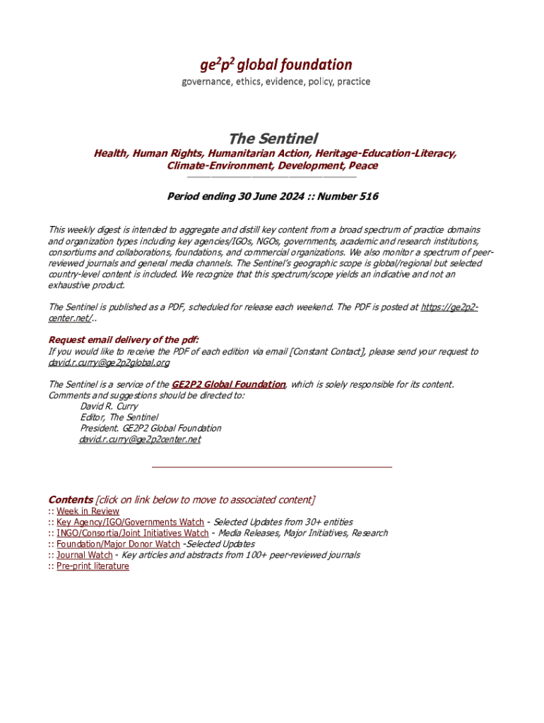 The SentinelHealth, Human Rights, Humanitarian Action, HeritageEducationLiteracy, ClimateEnvironment, Development, Peace ___Period ending 30 June 2024 :: Number 516 This weekly digest is intended to aggregate and distill key content from a broad spectrum of practice domains and organization types including key agencies/IGOs, NGOs, governments, academic and research institutions, consortiums and collaborations, foundations, and commercial organizations. We also monitor a spectrum of...
