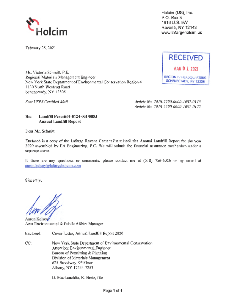 Holcim (US), Inc. P.O. Box 3 1916 U.S. 9W Ravena, NY 12143 www,lafargeholcim.usolcim February 26, 2021RECEIVED Ms. Victoria Schmitt, P.E. Regional Materials Management Engineer New York State Department of Environmental Conservation Region 4 1130 North Westcott Road Schenectady, NY 12306REGION I V HEAL)QUARTERS SCHENECTADY, NY 12306Article No. 70182290000010870115 Article No. 70182290000010870122Sent USPS Certified MailRe:MARO 1 2021Landfill Permit#40124001/0053 Annual Landfill ReportDear Ms