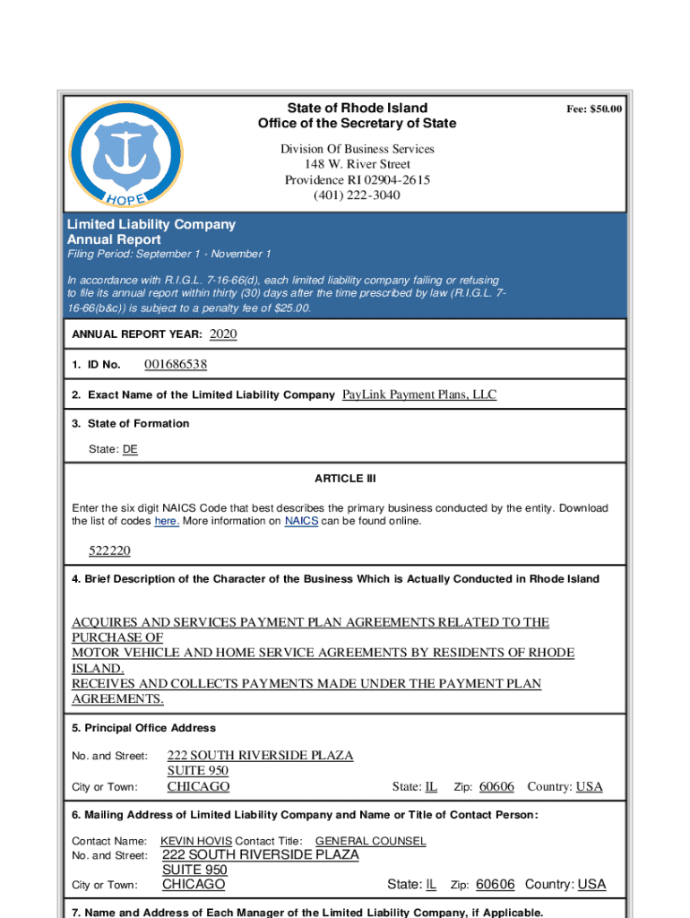State of Rhode Island Office of the Secretary of StateFee: $50.00Division Of Business Services 148 W. River Street Providence RI 029042615 (401) 2223040 Limited Liability Company Annual Report Filing