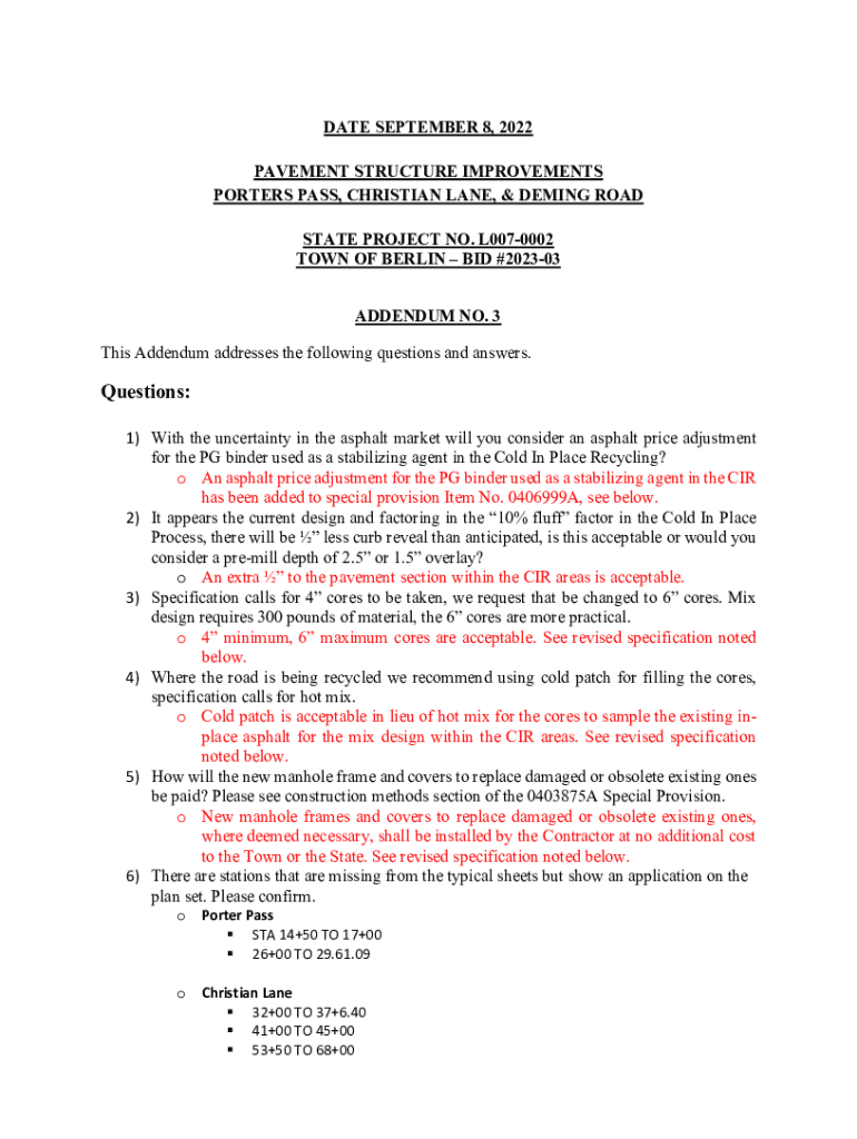 This document outlines the addendum for the Pavement Structure Improvements project in Berlin, detailing asphalt price adjustments, core sampling, and construction methodologies.