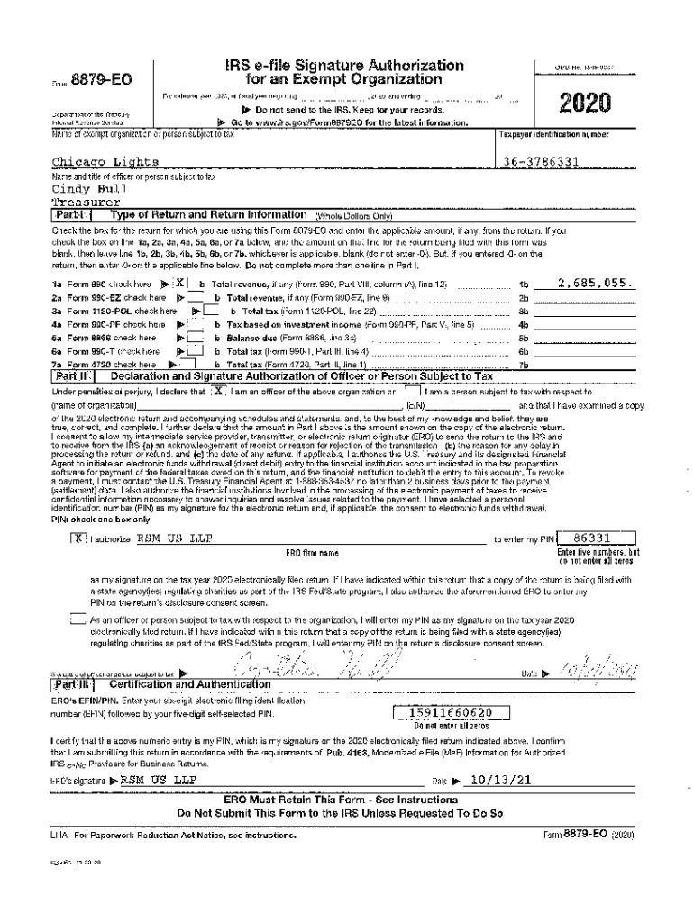 IRS file Signature Authorization 8019EOOMB No, 16450047for an Exempt Organization calendar year 2020, or fiscal year beginningDepartment of the Treasurers, 2020, and ending, 202 020Do not send to
