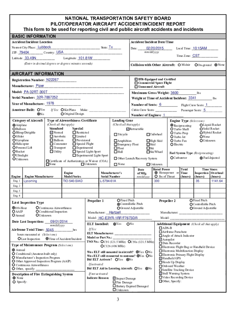 Detailed report of a 2015 aircraft accident involving N22267 in Lubbock, Texas. Includes accident details, crew information, and weather conditions.
