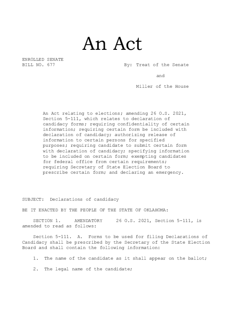 This Act updates Oklahoma election laws regarding candidacy declarations, ensuring confidentiality and establishing new requirements for candidates in 2023.