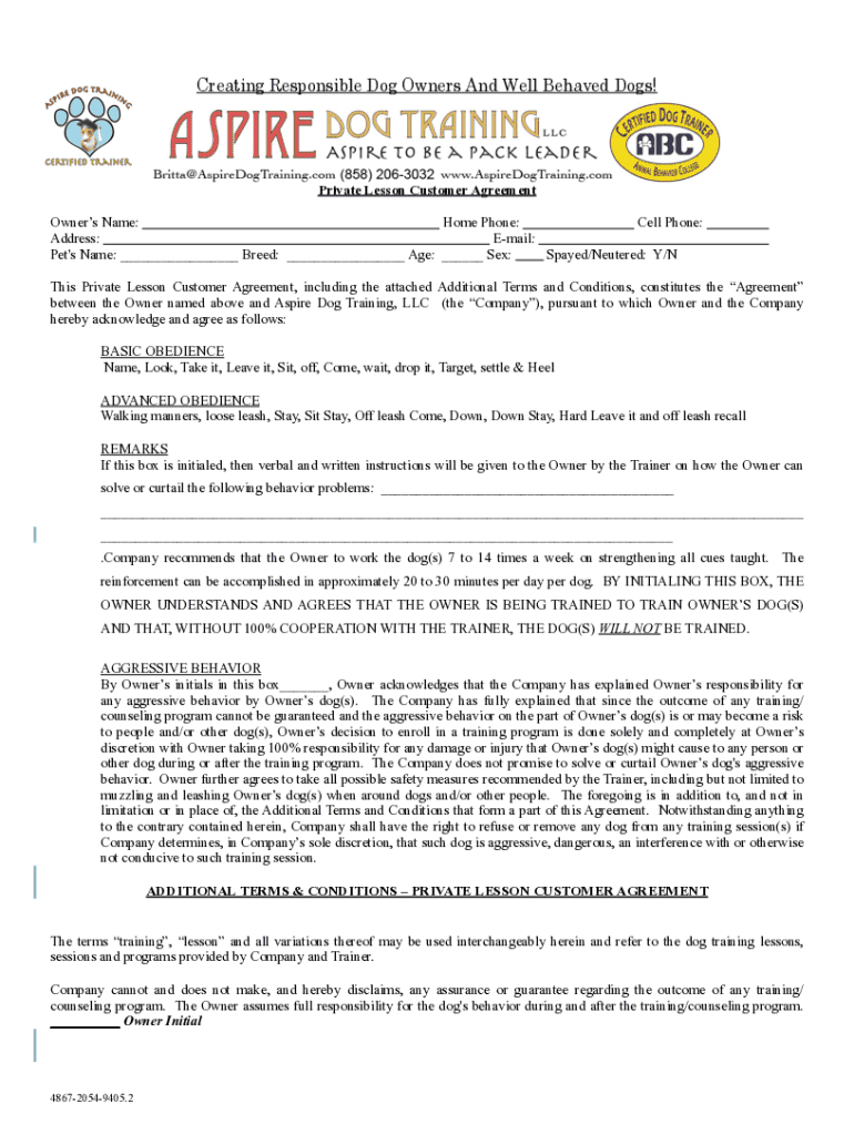 This agreement outlines the terms for dog training services, including obedience training, owner responsibilities, and safety measures for effective results.