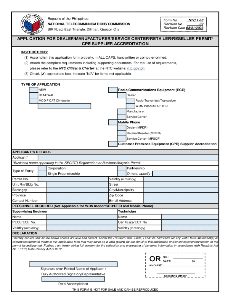 Complete the application to obtain a Telecommunications dealer, manufacturer, or service center permit with requirements as per NTC guidelines.