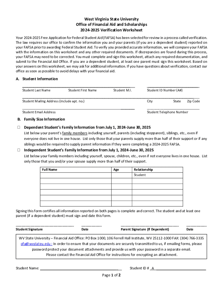 Complete the 2024-2025 Verification Worksheet for FAFSA verification at West Virginia State University to ensure accurate financial aid information.