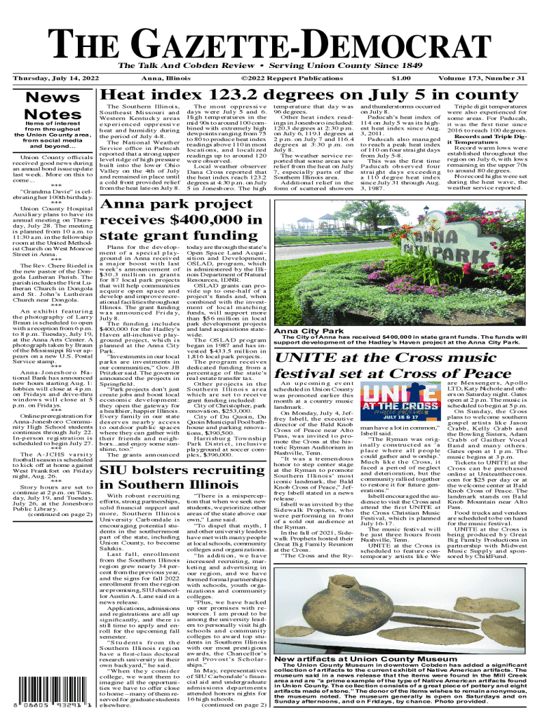 THE GAZETTEDEMOCRAT The Talk And Cobden Review Serving Union County Since 1849Thursday, July 14, 2022Anna, Illinois2022 Reppert Publications$1.00Volume 173, Number 31News Heat index 123.2 degrees on July 5 in county NotesItems of interest from throughout the Union County area, from social media and beyond...Union County officials received good news during an annual bond issue update last week. More on this to come... *** Grandma Davie is celebrating her 100th birthday