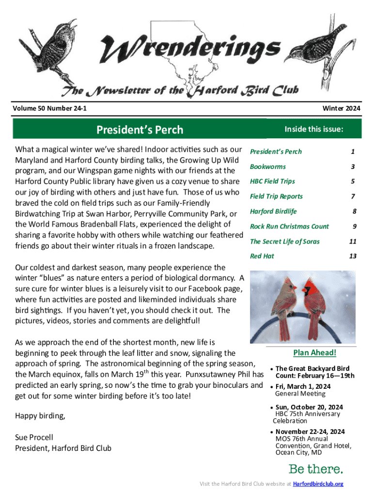 Explore the Hartford Bird Club\'s Winter 2024 newsletter, featuring birding events, member news, field trip reports, and insights into birding activities in Maryland.
