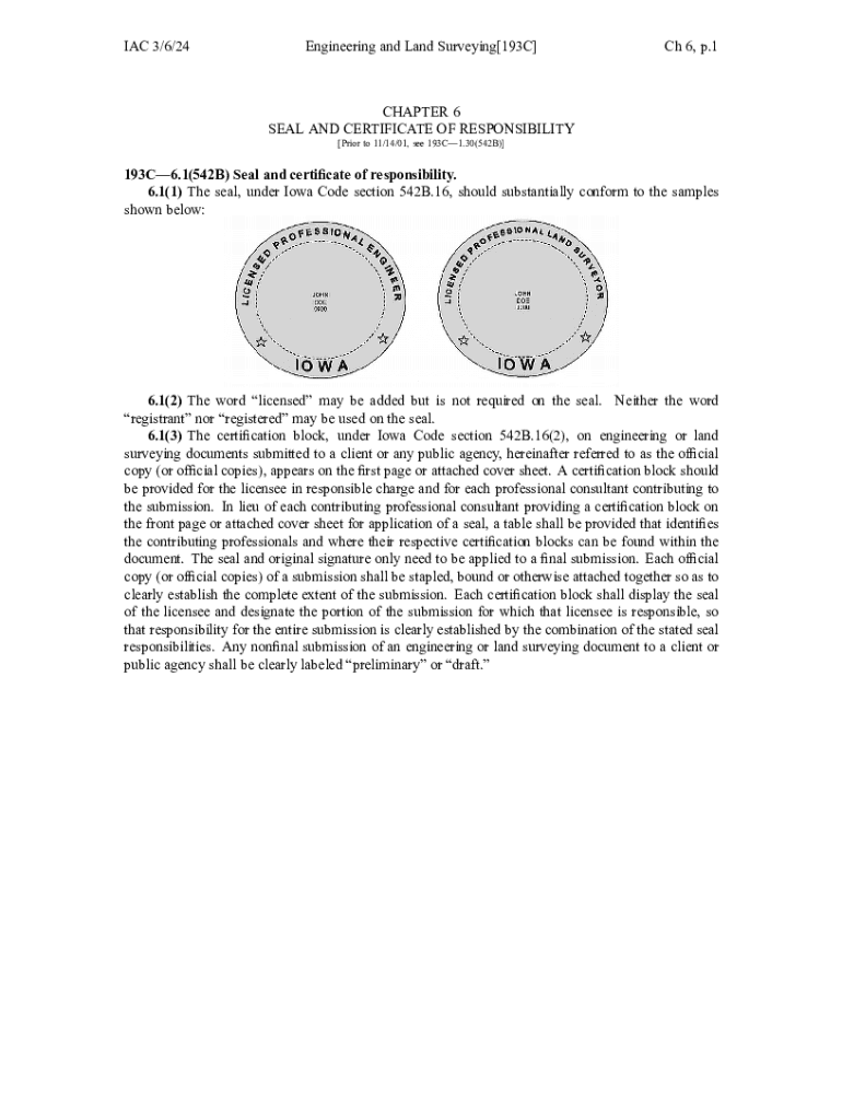 IAC 3/6/24Engineering and Land Surveying[193C]Ch 6, p.1CHAPTER 6 SEAL AND CERTIFICATE OF RESPONSIBILITY [Prior to 11/14/01, see 193C1.30(542B)]193C6.1(542B) Seal and certificate of responsibility.