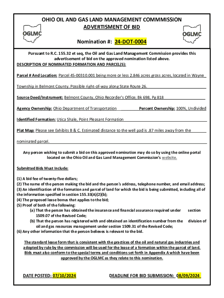 This document outlines the bidding process for the Ohio Oil and Gas Land Management Commission for leasing Utica Shale formation, detailing conditions and submission requirements.