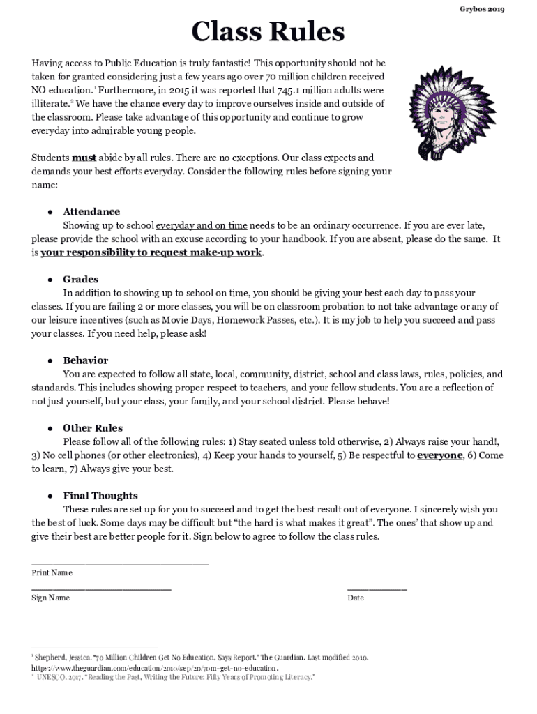 Grybos 2019Class Rules Having access to Public Education is truly fantastic! This opportunity should not be taken for granted considering just a few years ago over 70 million children received NO