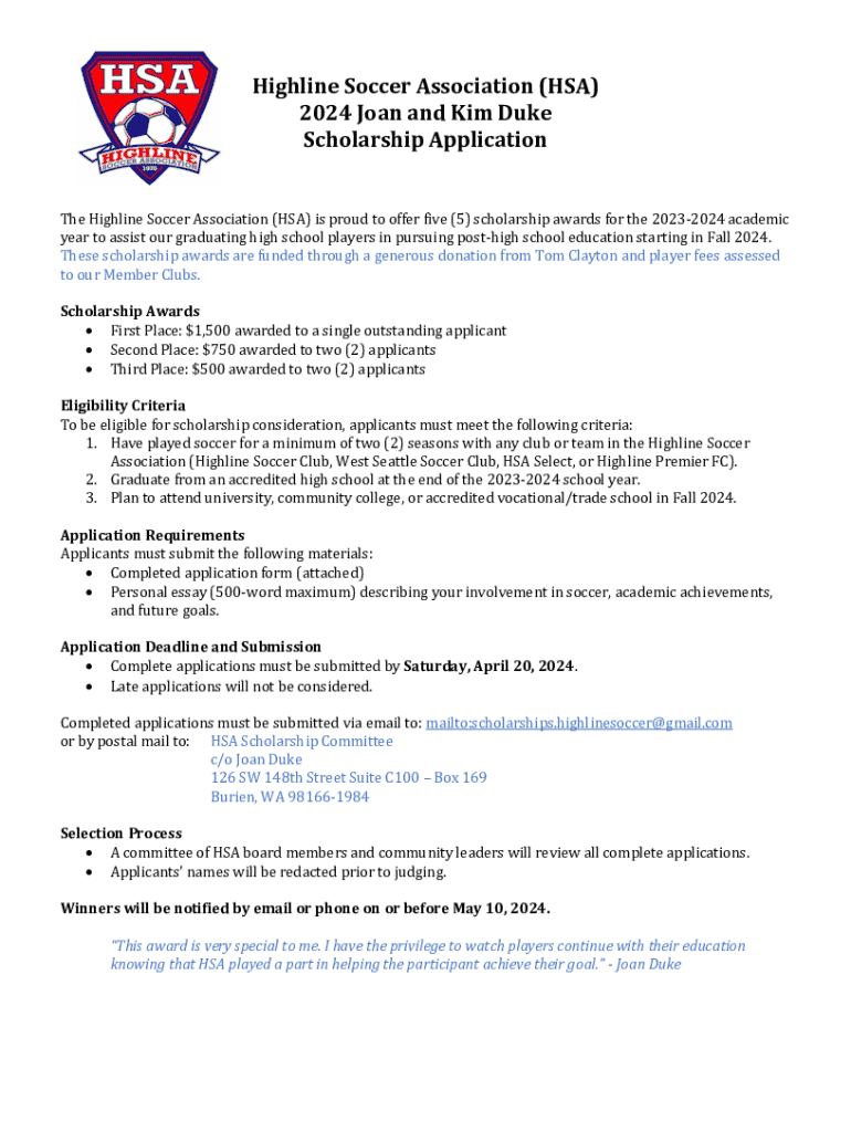 Apply for the 2024 Joan and Kim Duke Scholarships offered by Highline Soccer Association to support high school players pursuing education post-graduation.