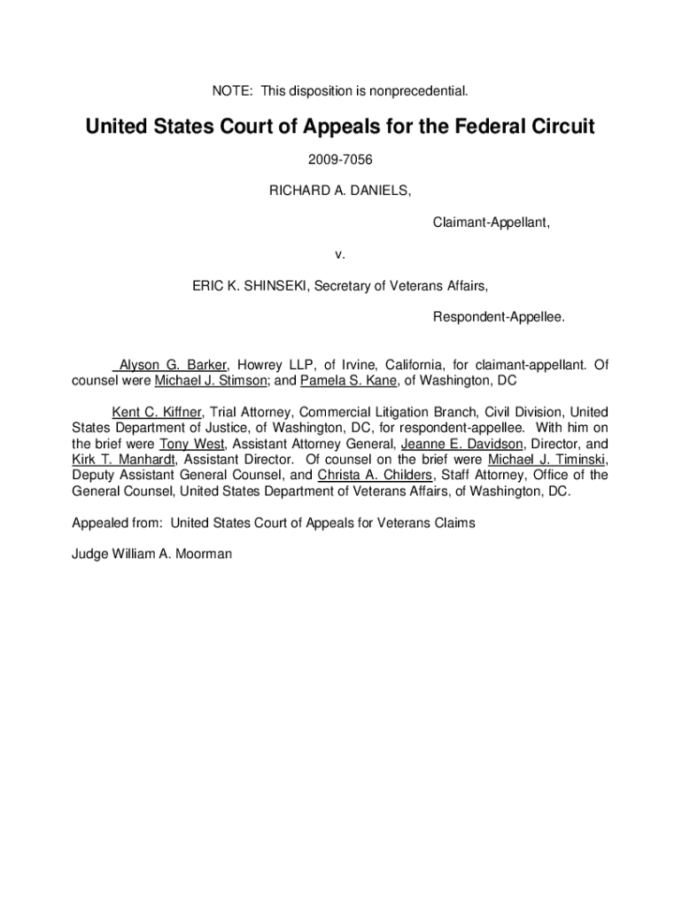 NOTE: This disposition is nonresidential. United States Court of Appeals for the Federal Circuit 20097056 RICHARD A. DANIELS, ClaimantAppellant, v. ERIC K. SHINE, Secretary of Veterans Affairs, RespondentAppellee.