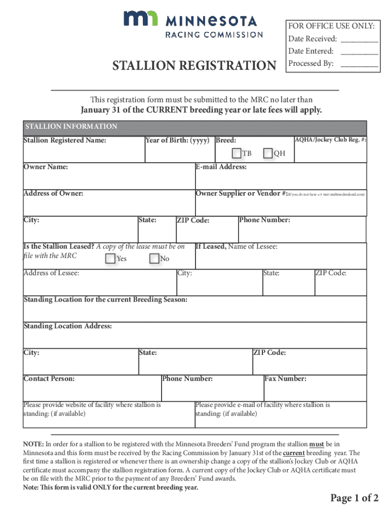 Complete the Stallion Registration Form for the Minnesota Breeders Fund by January 31, 2023, to avoid late fees. Ensure all required information is accurate.