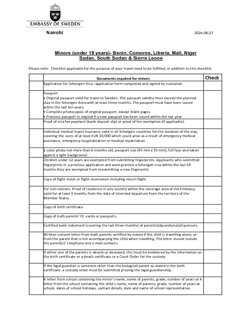 Nairobi20240627Minors (under 18 years) Benin, Comoros, Liberia, Mali, Niger Sudan, South Sudan & Sierra Leone Please note: Checklist applicable for the purpose of your travel need to be fulfilled,