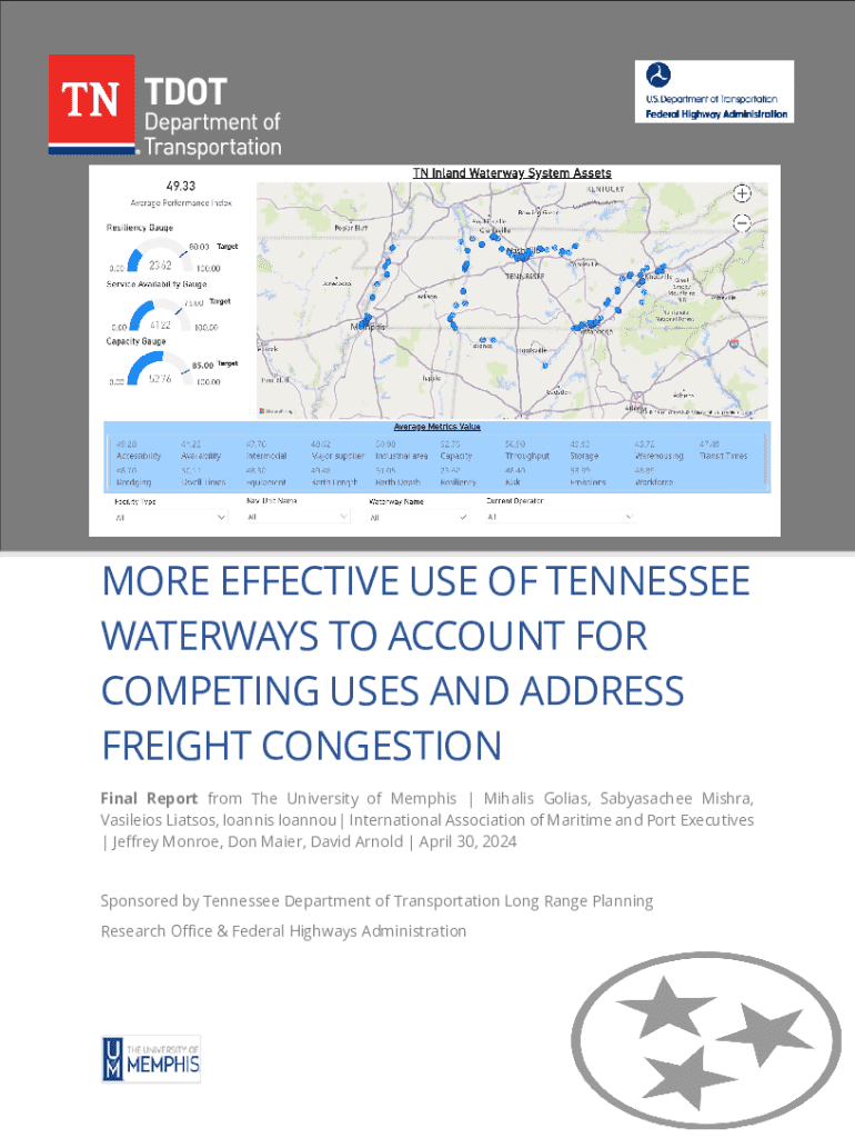 MORE EFFECTIVE USE OF TENNESSEE WATERWAYS TO ACCOUNT FOR COMPETING USES AND ADDRESS FREIGHT CONGESTION Final Report from The University of Memphis | Mihalis Golias, Sabyasachee Mishra, Vasileios Liatsos, Ioannis Ioannou| International Association of Maritime and Port Executives | Jeffrey Monroe, Don Maier, David Arnold | April 30, 2024 Sponsored by Tennessee Department of Transportation Long Range Planning Research Office & Federal Highways AdministrationDISCLAIMER This research was funded...