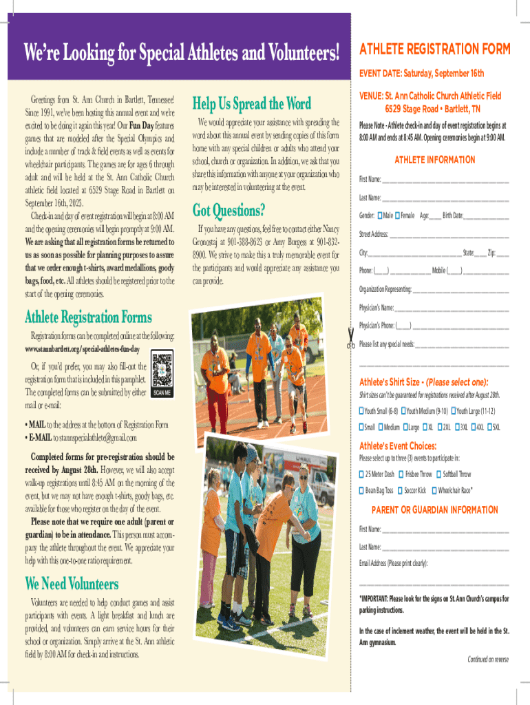 Register for the Special Athletes Fun Day at St. Ann Catholic Church on September 16, 2023. Volunteers needed, complete forms by August 28.