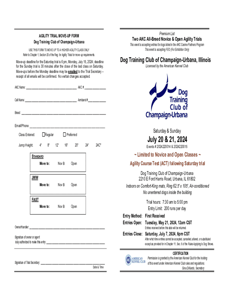 Premium ListAGILITY TRIAL MOVEUP FORM Dog Training Club of ChampaignUrbanaTwo AKC AllBreed Novice & Open Agility TrialsThis event is accepting entries for dogs listed in the AKC Canine Partners Program
