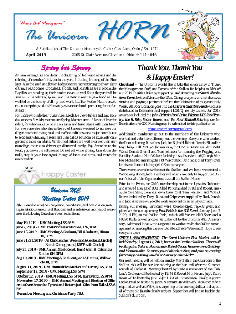 Nun AUT NunquamThe UnicornHORNA Publication of The Unicorn Motorcycle Club / Cleveland, Ohio / Est. 1971 April 20192205 St. Clair Avenue, Cleveland Ohio 441144046Spring has Sprung As I am writing