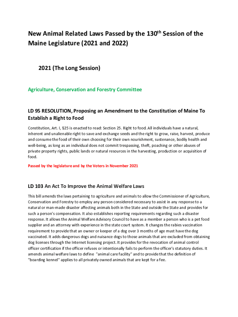New Animal Related Laws Passed by the 130th Session of the Maine Legislature (2021 and 2022) 2021 (The Long Session) Agriculture, Conservation and Forestry Committee LD 95 RESOLUTION, Proposing an