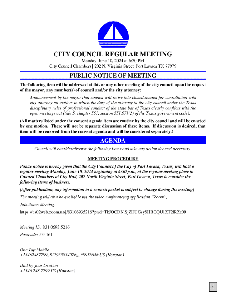 CITY COUNCIL REGULAR MEETING Monday, June 10, 2024, at 6:30 PM City Council Chambers | 202 N. Virginia Street, Port Lava ca TX 77979PUBLIC NOTICE OF MEETING The following item will be addressed at