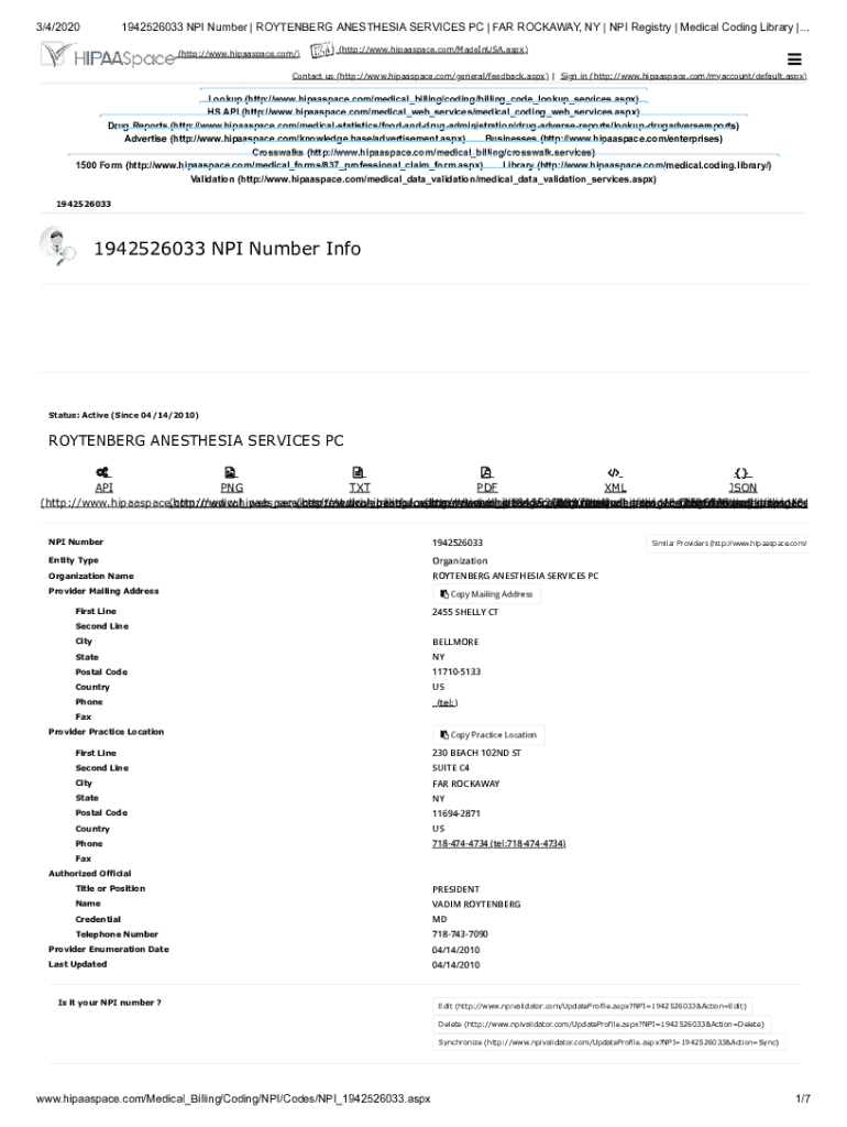 3/4/20201942526033 NPI Number | ROSENBERG ANESTHESIA SERVICES PC | FAR ROCKY, NY | NPI Registry | Medical Coding Library | (http://www.hipaaspace.com/)(http://www.hipaaspace.com/MadeInUSA.aspx)Contact