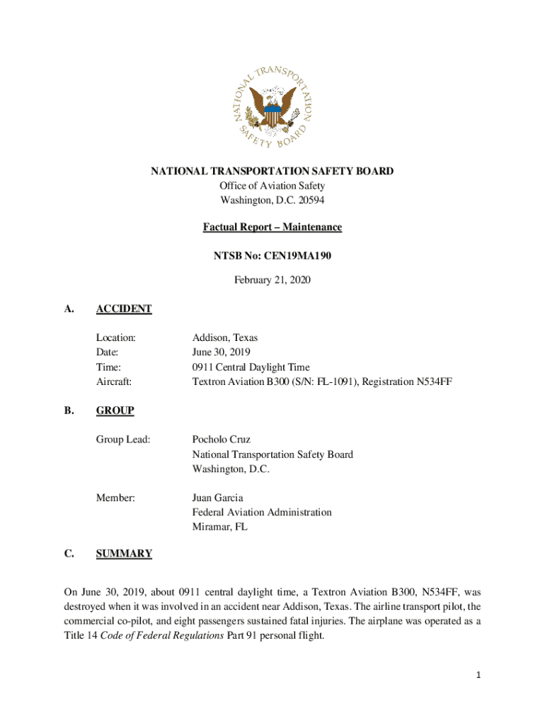 Explore the NTSB\'s factual report detailing the Textron Aviation B300 accident in Addison, Texas. This document covers the investigation and maintenance details.