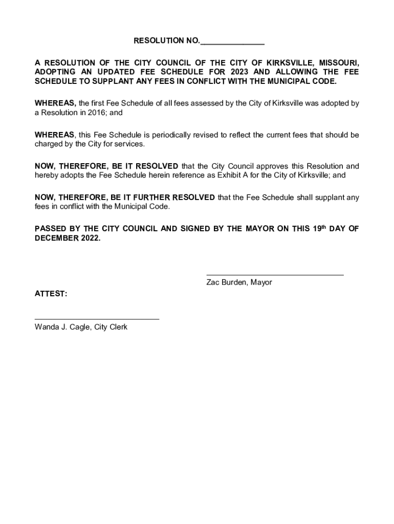 This document outlines the updated fee schedule adopted by Clarksville City Council, effective 2023, detailing various fees for services and permits.