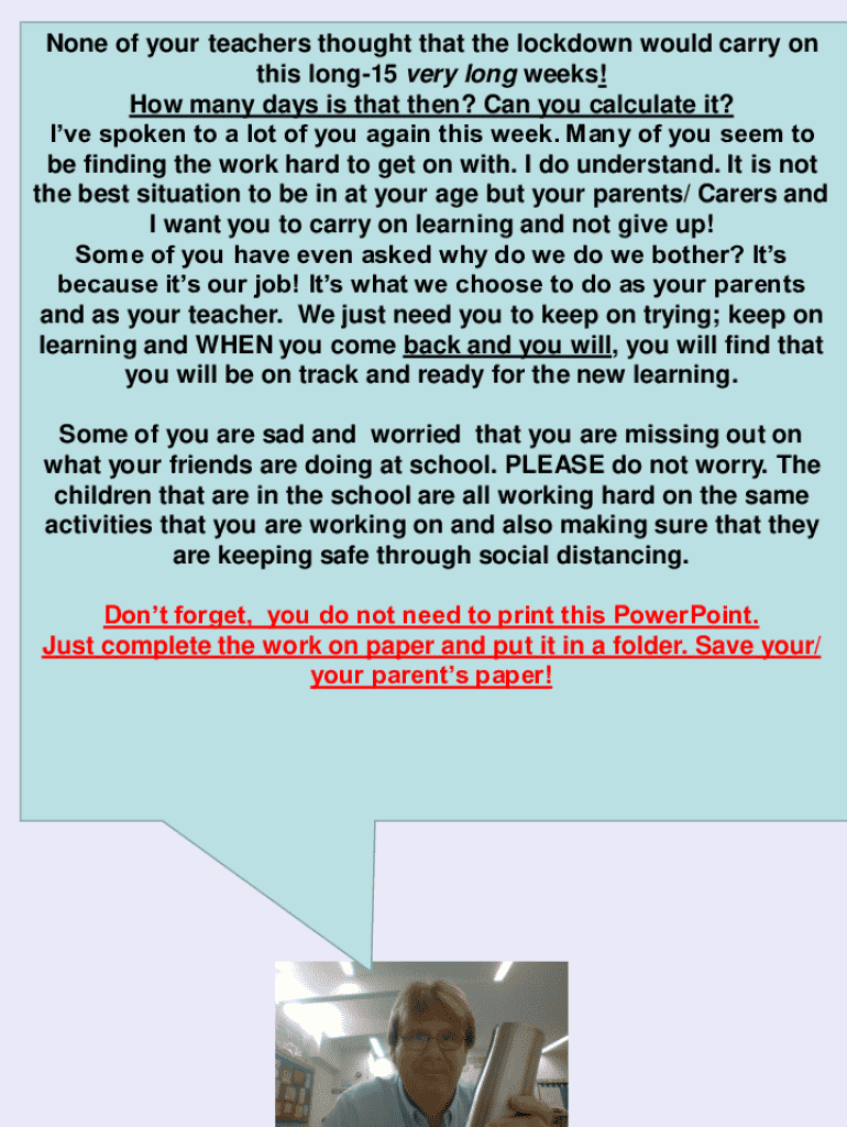 None of your teachers thought that the lockdown would carry on this long15 very long weeks! How many days is that then? Can you calculate it? I've spoken to a lot of you again this week. Many of you