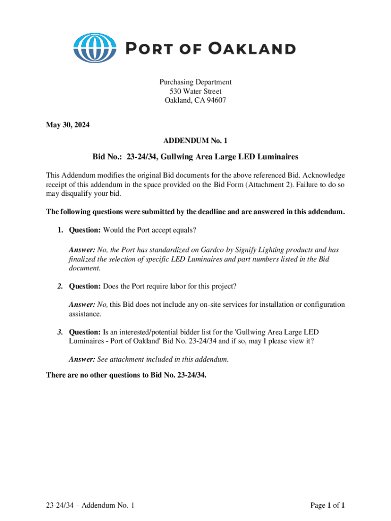 This document outlines Addendum No. 1 for Bid No. 23-24/34, addressing questions and modifications for the Gulling Area Large LED Luminaires project.