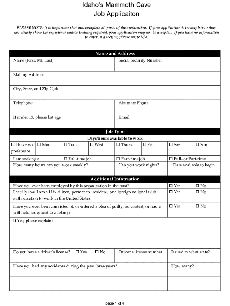 Complete the Idaho Mammoth Cave job application accurately to ensure eligibility. Include personal details, employment history, and references.