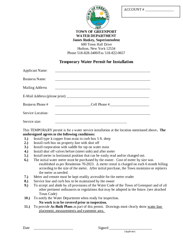 The Temporary Water Permit for Installation is a fillable form in MS Word extension that has to be completed and signed for specified purpose. Then, it is provided to the relevant addressee to provide certain details of any kinds. The completion and signing is able in hard copy or with a trusted solution like PDFfiller. These tools help to fill out any PDF or Word file without printing out. It also lets you edit it depending on your requirements and put legit electronic signature. Upon finishing, the user sends the Temporary Water Permit for Installation to the respective recipient or several of them by mail or fax. PDFfiller has a feature and options that make your template printable. It provides a number of settings when printing out appearance. It does no matter how you'll distribute a form after filling it out - physically or electronically - it will always look professional and clear. In order not to create a new editable template from scratch again and again, turn the original file into a template. Later, you will have a rewritable sample.