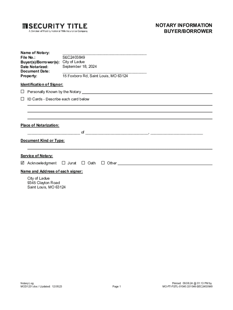 This document contains essential notary information for buyer/borrower transactions in the City of Ladle, providing details and acknowledgments needed for notarization.