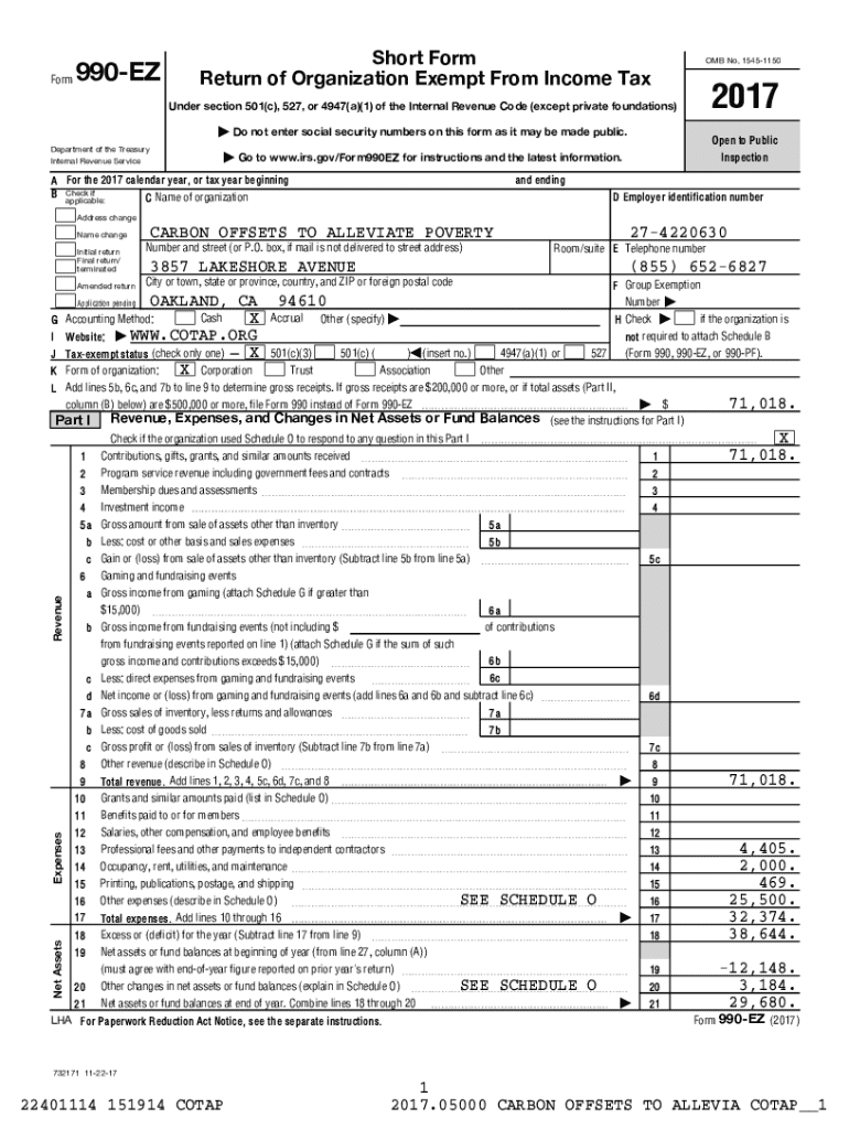 Form 990EZDepartment of the Treasury Internal Revenue ServiceShort Form Return of Organization Exempt From Income Tax Under section 501(c), 527, or 4947(a)(1) of the Internal Revenue Code (except private foundations)2017| Do not enter social security numbers on this form as it may be made public.Open to Public| Go to www.irs.gov/Form990EZ for instructions and the latest information.InspectionA For the 2017 calendar year, or tax year beginning if B Check C Name of organization applicable: Address