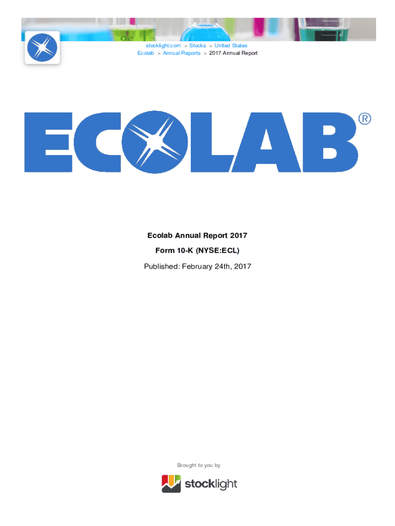 Stocklight.com Stocks United States Eco lab Annual Reports 2017 Annual ReportEcolab Annual Report 2017 Form 10K (NYSE:ECL) Published: February 24th, 2017Brought to you byEcolab (ECL) Historical Annual