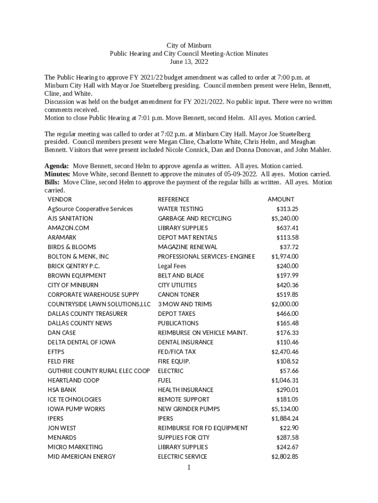 The Public Hearing and City Council Meeting - Action Minutes is a Word document that has to be completed and signed for certain reasons. In that case, it is furnished to the exact addressee to provide specific details of any kinds. The completion and signing is available in hard copy or using a suitable service e. g. PDFfiller. Such tools help to complete any PDF or Word file without printing them out. It also allows you to edit its appearance for your needs and put an official legal digital signature. Upon finishing, the user ought to send the Public Hearing and City Council Meeting - Action Minutes to the respective recipient or several of them by mail and even fax. PDFfiller offers a feature and options that make your blank printable. It offers different options for printing out appearance. No matter, how you will distribute a form - physically or electronically - it will always look neat and clear. To not to create a new file from scratch again and again, turn the original Word file into a template. Later, you will have an editable sample.