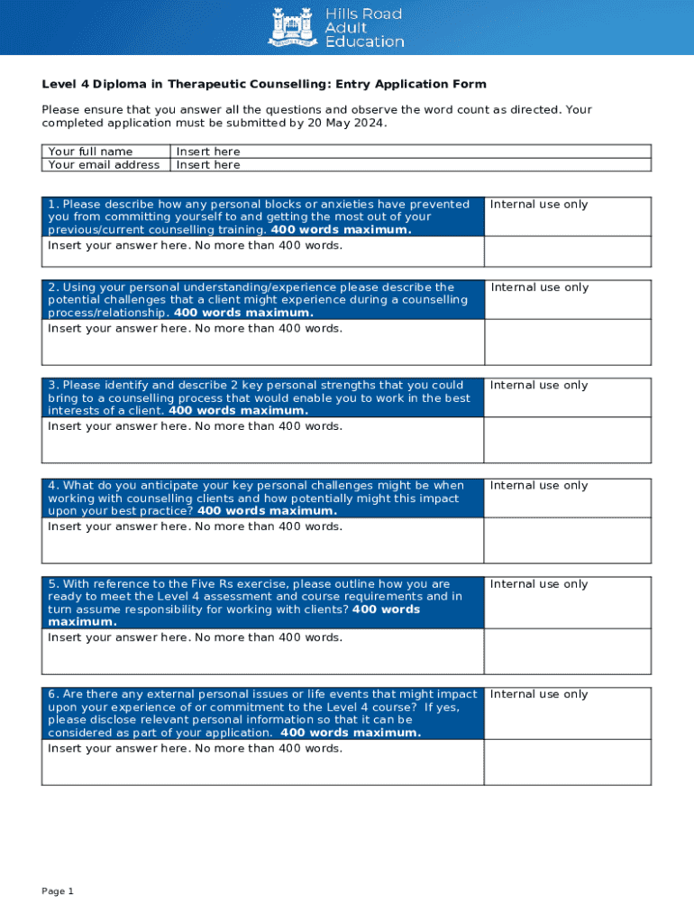 Template Level 4 Diploma in Therapeutic Counselling Entry Application instructions